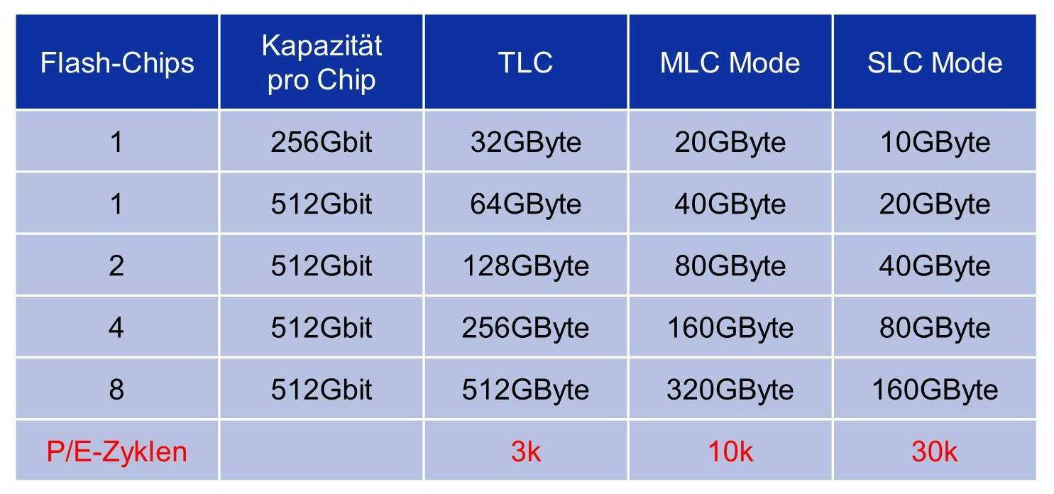 Die Flash-Hersteller steigern die Kapazitäten ihrer Chips, indem sie zu höher integrierten Technologien übergehen. Echte SLC-Chips sind kaum noch verfügbar, der Schwerpunkt der Produktion liegt auf TLC. Anwendungen verlangen immer noch die Eigenschaften der SLC-Chips, wie lange Datenhaltung, viele Schreibzyklen und Zuverlässigkeit. TLC-Speicher werden daher in einem niedrigeren «Mode» betrieben, wobei zwar die Kapazität zurückgeht, die Zahl der möglichen Schreibzyklen jedoch ansteigt. Die folgende Tabelle zeigt, welche Kapazitäten mit Chips unterschiedlicher Integrationsdichte zu erzielen sind.