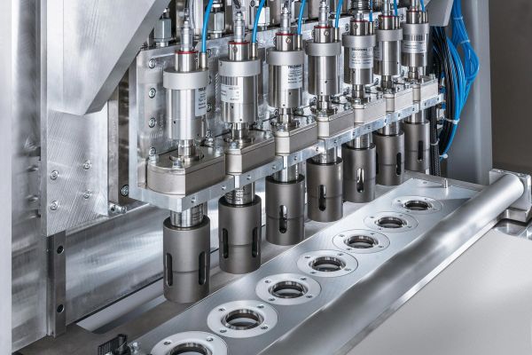 Bei diesem Ausstanzprozess per Cut-and-Seal-Verfahren werden die Filter auch gleich passgenau in den Kapseln platziert und im nächsten Schritt fest mit der Kapsel verbunden - ebenfalls mit Hilfe von Ultraschall. Auch an dieser Station sind 14 Schweisssonotroden parallel eingesetzt, die mit ähnlicher Geschwindigkeit arbeiten wie das Cut-and-Seal-Verfahren und ebenso saubere Ergebnisse liefern. Dadurch können auf der Anlage pro Minute 800 Kaffeekapseln gefertigt werden. Der Prozess ist zuverlässig und sicher, da das Ultraschallverfahren nur von wenigen Parametern abhängt, die sich einfach einstellen und überwachen lassen. Die Parameter sind die Schweissenergie, -kraft und -zeit sowie die maximale Leistung (Pmax).