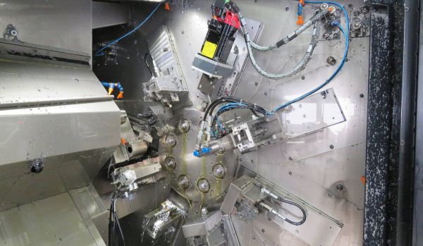 «Die acht Spindeln ermöglichen es uns komplexere Teile aufzunehmen, da 6 Stationen voll verfügbar sind für zusätzliche Operationen», bekräftigt Boris Leuenberger. Der Serienwechsel ist schnell erledigt, so dass die Maschine dauerhaft an mittleren bis grossen Serien arbeiten kann.