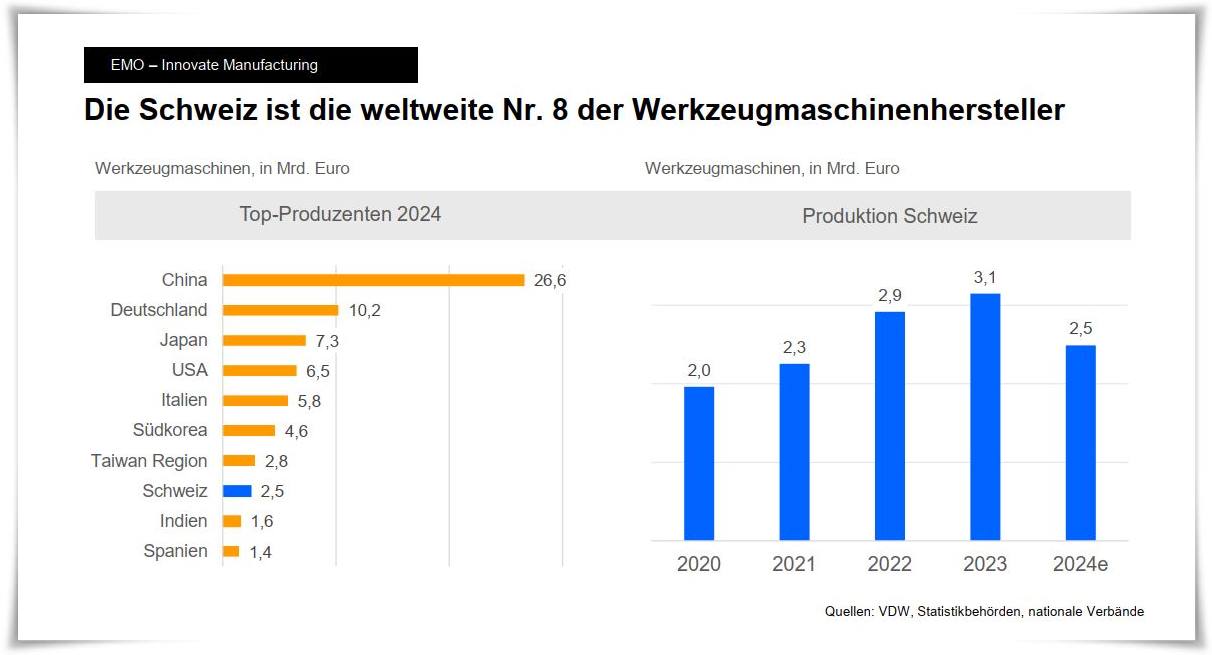 Die Schweiz gehört weiterhin zur Weltspitze in der Werkzeugmaschinenindustrie. 2024 lag die Produktion bei rund 2,5 Milliarden Euro, womit sie Platz acht im globalen Vergleich einnimmt. Noch beeindruckender ist der Exportwert: Über 2,1 Milliarden Euro an Maschinen verliessen das Land – das sich damit auf Rang sechs der weltweit grössten Exportnationen positioniert.
