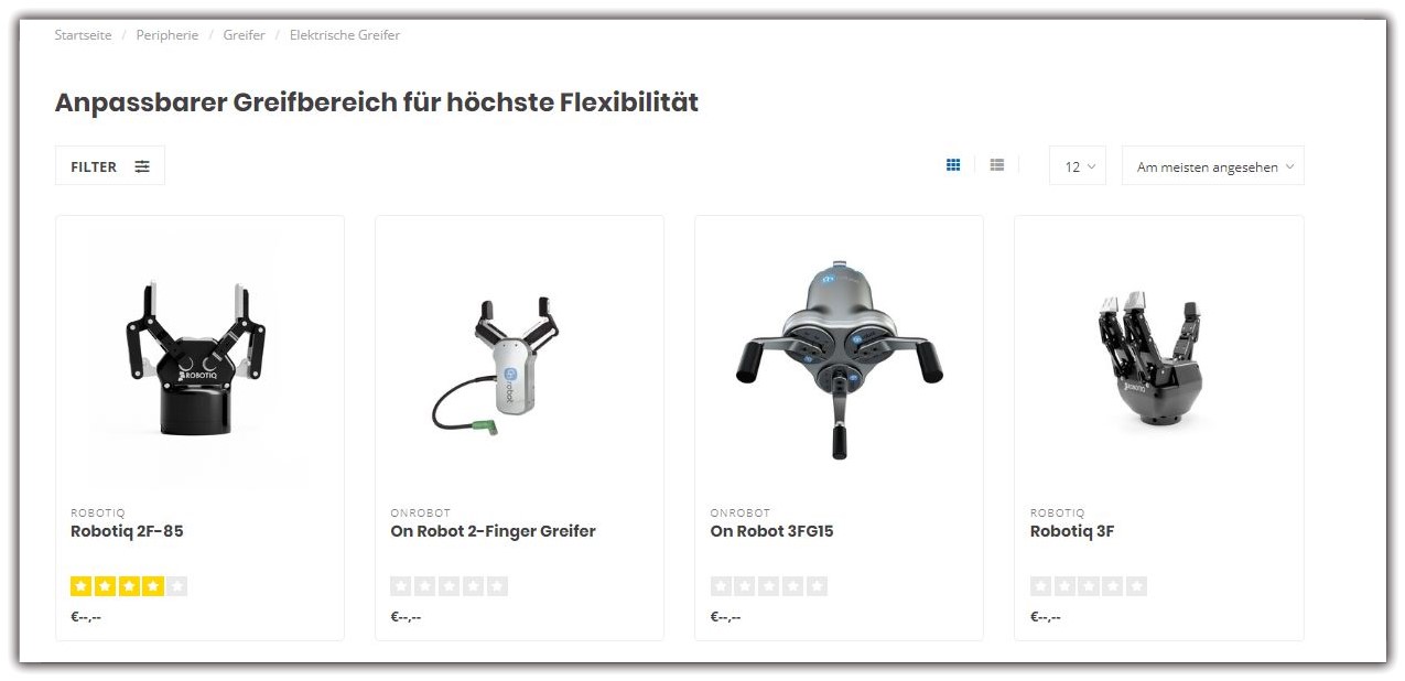 Wir haben viel Wert daraufgelegt, dass der Webshop trotz des anspruchsvollen Segmentes, in welchem wir uns bewegen, so einfach und übersichtlich wie möglich gehalten wird. Viele Produkte bedürfen aber spezifischen Varianten; diese sind übersichtlich dargestellt und es ist für den Kunden einfach zu erkennen, welche Varianten er für seinen Roboter oder seine Applikation benötigt.