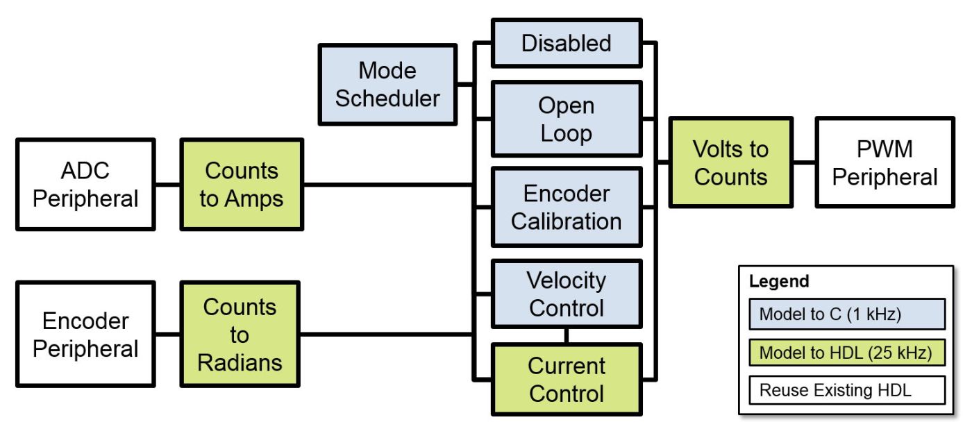 Das ursprüngliche Modell wird mit den neuen Algorithmuskomponenten ergänzt (Abbildung 4). Um die Systemsimulation zu ermöglichen, werden konzentrierte Parametermodelle bestehender Peripheriekomponenten erstellt, die mit dem Motormodell interagieren. Bestehender HDL-Code für z.B. die Peripheriekomponente Encoder, wird im bereitgestellten Entwurf wiederverwendet. Der Encoder liest einen Datenstrom digitaler Impulse bei 50 MHz und übersetzt diese in Zählersignale, die vom Regelungsalgorithmus mit 25 kHz gelesen werden.