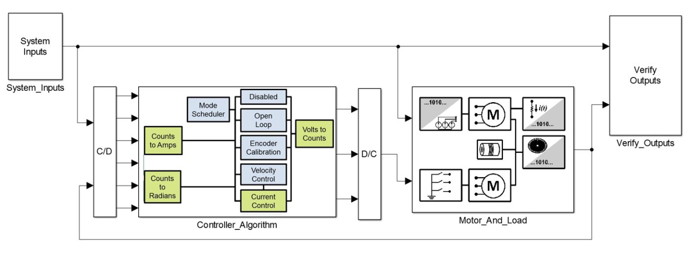 Ein vom Algorithmus-Ingenieur bereitgestelltes erstes Systemsimulationsmodell muss um weitere Komponenten ergänzt werden, die für die Bereitstellung auf der SoC-Prototypenplattform erforderlich sind. Das Modell umfasst einen Regelalgorithmus für ein auf Datenblattparametern basiertes Motormodell. Der Regelalgorithmus besteht aus einer äusseren Geschwindigkeitsregelschleife, die eine innere Stromregelschleife mithilfe von FOC regelt.