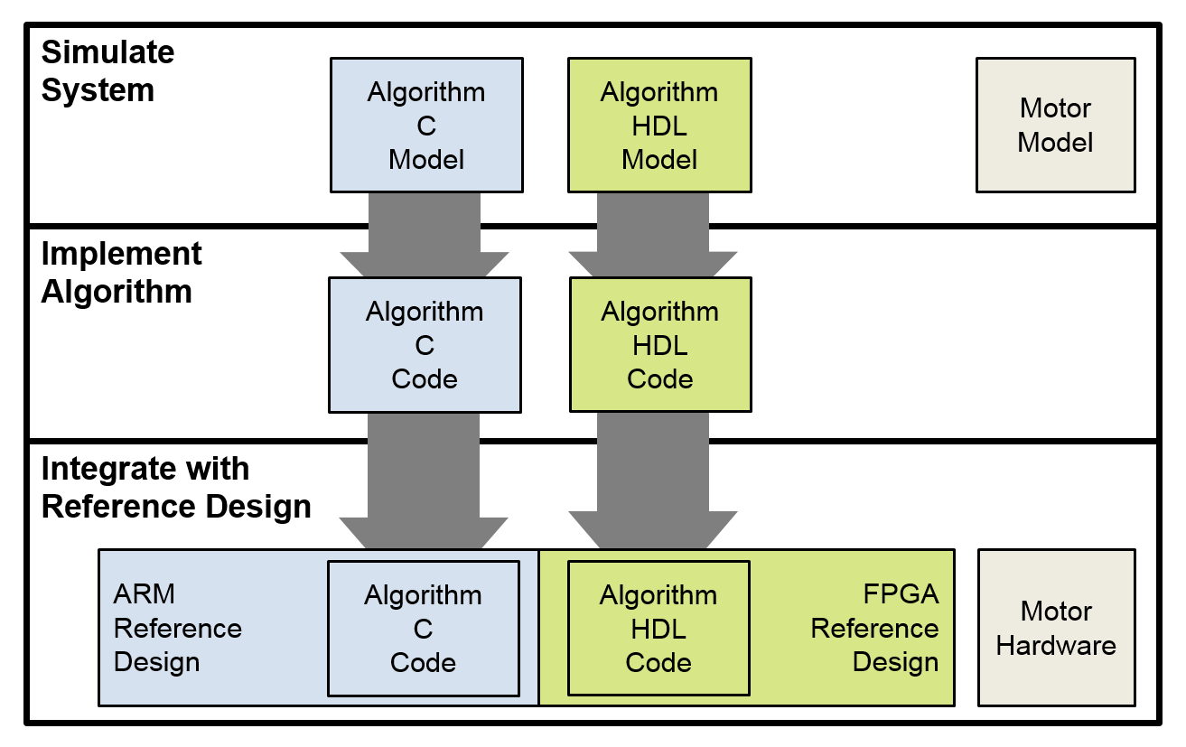 Für die Implementierung auf SoCs hat sich ein Workflow bewährt, der aus einer Kombination von aus Modellen generiertem Code und manuell bereitgestelltem Code besteht. Der manuell programmierte Code wird hierbei als Referenzdesign bezeichnet. Vom Algorithmus-Entwickler werden Modelle zur Verfügung gestellt, die durch iteratives Hinzufügen von Implementierungsdetails weiter ausgearbeitet werden. Mit jeder Iteration wird das Systemverhalten erneut simuliert, um die korrekte Funktion der Modelle, sowie des aus den Modellen generierten Codes zu gewährleisten. Dieser wird in einem automatisierten Schritt mit dem Referenzdesign integriert und in einem wiederholbaren Prozess zur Hardware-Implementierung weiterentwickelt (Abbildung 1).