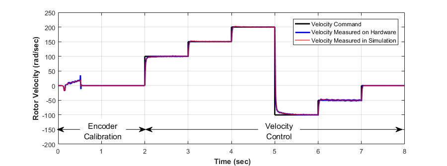 Eine direkte Modellierung dieses Impulsstroms würde eine 50-MHz-Dynamik in das Systemmodell einführen und die Simulationszeit beträchtlich erhöhen. Stattdessen wird ein konzentriertes Parametermodell des Encoders erstellt, das die ideale Rotorposition aus dem Motormodell in das Encoder-Zählersignal umwandelt, das von den Algorithmuskomponenten verarbeitet wird. Modellierung auf dieser Genauigkeitsstufe ermöglicht die Simulation der zum Testen der Encoder-Kalibrierungskomponente erforderlichen Startbedingungen, sowie die Einführung von Positions-Quantisierungseffekten zum Testen der Geschwindigkeitsregelungs-Komponente (Abbildung 5) bei gleichzeitiger Wahrung angemessener Simulationszeiten.