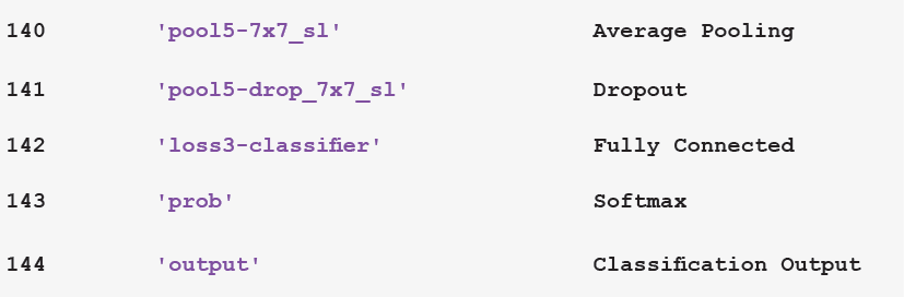 Um GoogLeNet für die Klassifizierung neuer Bilder zu trainieren, konfiguriert man die letzten drei Ebenen des Netzwerks neu. Diese Schichten enthalten die Informationen, die benötigt werden, um die Features, die das Netzwerk extrahiert, in Klassifikationswahrscheinlichkeiten und Labels zusammenzuführen. GoogLeNet hat 144 Schichten . Mit einem einfachen Befehl kann man sich die letzten fünf Schichten anzeigen lassen: