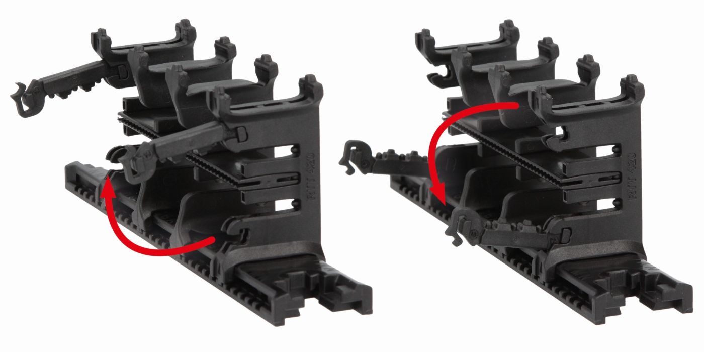 Die Schutzschläuche können materialschonend eingeschnappt und jederzeit wieder aus der Halterung genommen werden. Bei Anwendungen mit hoher Belastung kann der UH-Halter optional mit dem Verschlussbügel Typ BL geschlossen werden. Dieser rastet ein und ist werkzeuglos zu montieren. Durch die Verschlussbügel erhalten die Schutzschläuche zusätzlichen Halt.