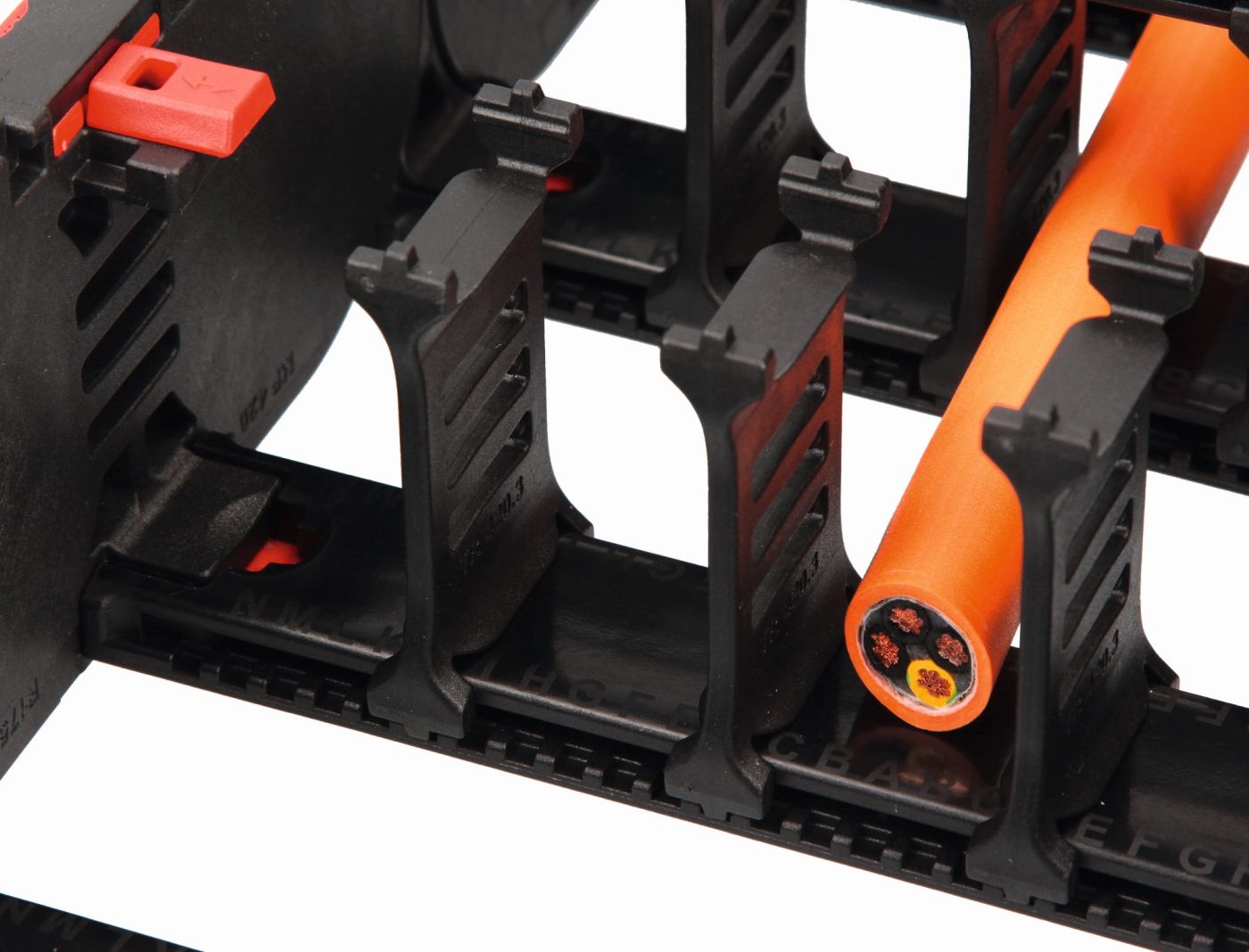- Und eine optische Kontrolle des Verriegelungsstatus: Der rote Verriegelungsschieber hebt sich farblich von der Energiekette ab. Dadurch ist der Schliessstatus sehr einfach an der Position des Schiebers zu erkennen.