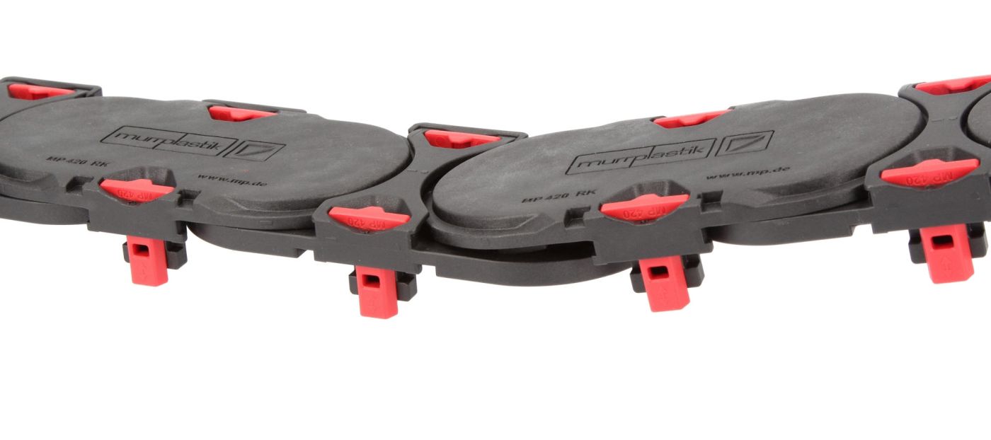 Der Dämpfungsschuh ist verschleissfrei und besteht aus zwei Komponenten: dem Träger und der dämpfenden Weichkomponente. Ein Geräuschemissionstest im Testlabor der Murrplastik hat gezeigt, dass eine Geräuschreduzierung der MP 420 Evochain um bis zu 25 dB(A) erreicht wird. Der Testwert basiert auf dem Vergleich mit und ohne Verwendung des Aussendämpfers in Kombination mit dem Innendämpfer mit Elastomer-Dämpfungselement.