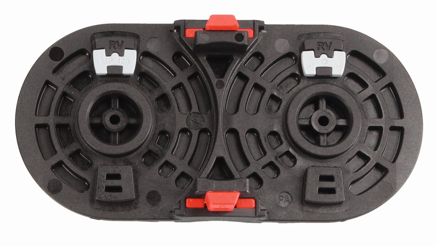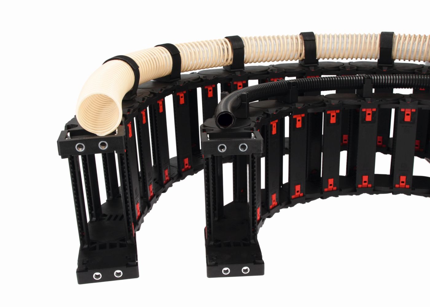 Die MP 420 Evochain ist mit der Evolock Rahmensteg-Verriegelung ausgestattet. Es handelt sich hierbei um einen roten Verriegelungsschieber mit dem die Energiekette sehr einfach und schnell geöffnet und geschlossen wird. Und dies ist auch möglich, wenn die Energiekette in einer Ablegewanne geführt wird. Der Vorteil ist eine grosse Zeitersparnis, da die Energiekette nicht aus der Ablegewanne herausgenommen werden muss. Das Öffnen der Rahmenstege ist auch bei montierten Gleitschuhen im Innenbogen oder mit Dämpfungsschuhen im Aussenbogen möglich. Da die MP 420 Evochain sowohl am Innenbogen als auch am Aussenbogen mit der Evolock Technologie ausgestattet ist, ist die Belegung mit Leitungen und Schläuchen von beiden Seiten möglich (oben und unten).