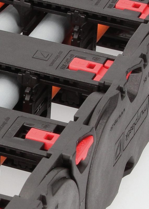 Eine besonders hohe Stabilität und Lebensdauer ist bei Energieketten-Anwendungen mit Querbeschleunigung und seitlich liegender freitragender Anwendung gefragt. Die MP 420 Evochain verfügt über eine stabile Verbindung der einzelnen Seitenglieder mit der Nut-und-Feder-Technik (Hinterschnitt).