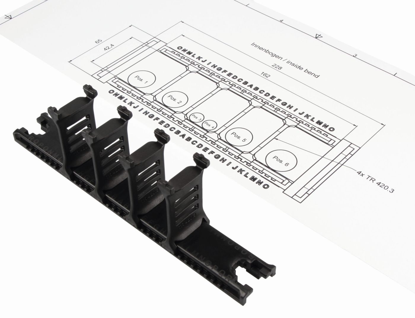 Die Rahmenstege der MP 420 Evochain verfügen über eine Buchstabenkennzeichnungsleiste. Diese ermöglicht eine einfache und eindeutige Zuordnung und Fixierung der Innenaufteilung. Der mp-ChainBuilder 3.0 (Online-Konfigurator für Energieketten: www.mympchain.com) stellt einen fertigen Montageplan – mit integrierter Buchstabenkennzeichnung – für die Innenaufteilung zur Verfügung. Die Montage ist dadurch ein Kinderspiel und schnell erledigt.